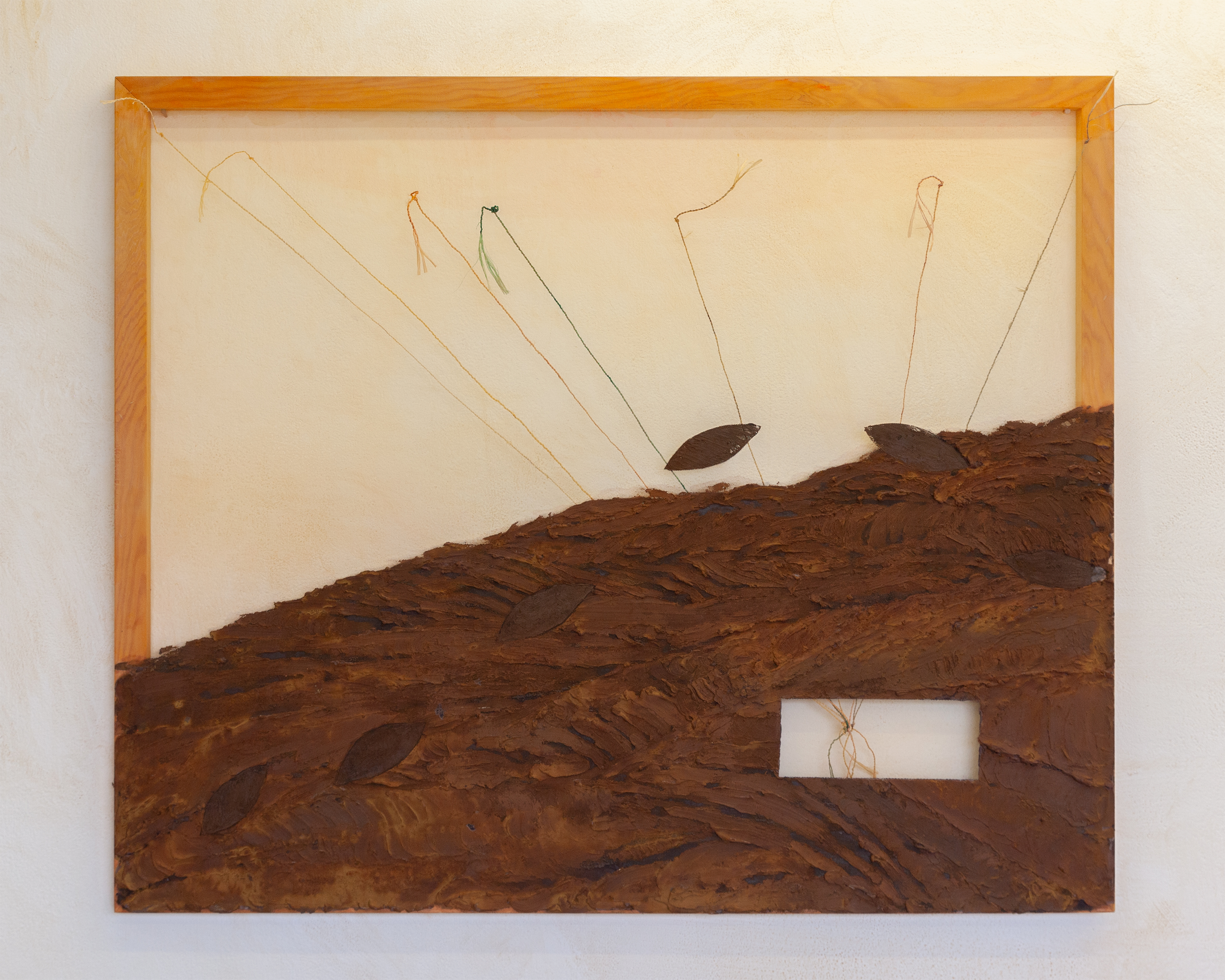 Different ideas related to values, certainty, and possibility of knowing are explored within individual paintings. In one case, a decaying cement structure leans forward, perhaps pointing to the future while Locals© slippers stand below, watching. In another, the highest point of the mountain fades away into an uncertain quantum field, while rocks used to make the paint are tied to the bottom of the painting, solid and captured. The paintings are made with a range of found and natural materials on a semi-transparent fabric and some are double-sided, lending themselves physically to the open-endedness of the narratives within the work.